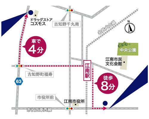 - 【お車の場合】江南駅西口から県道180号を進み、古知野町福寿交差点を右折。すいとぴあ名草線 / 県道63号を進んですぐ。